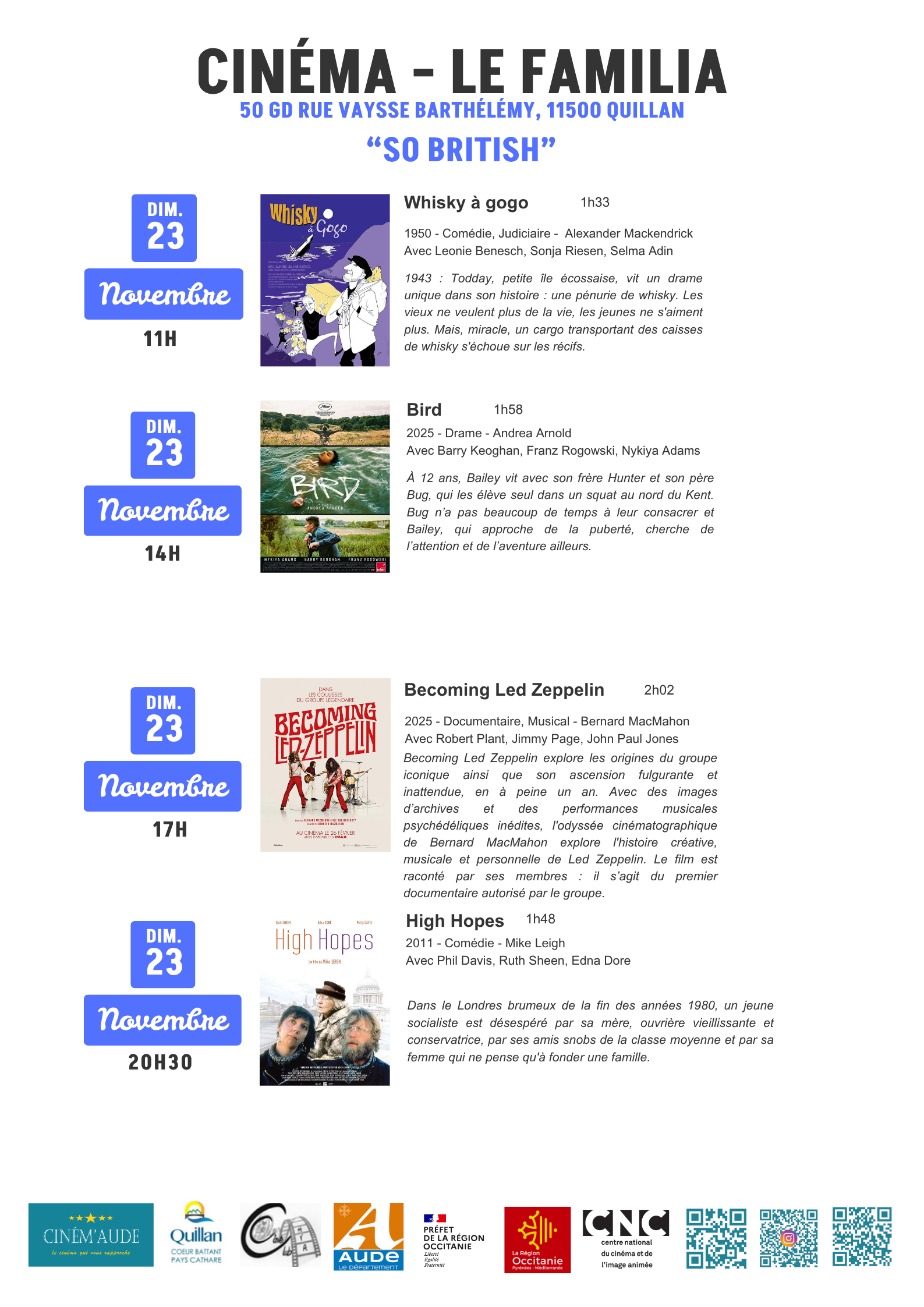 Le Ciné-Club de Quillan vous donne rendez-vous pour une projection spéciale de "So British" ; un programe de 4 films britanniques, le dimanche 23 novembre sur toute la journée ! Au programme :