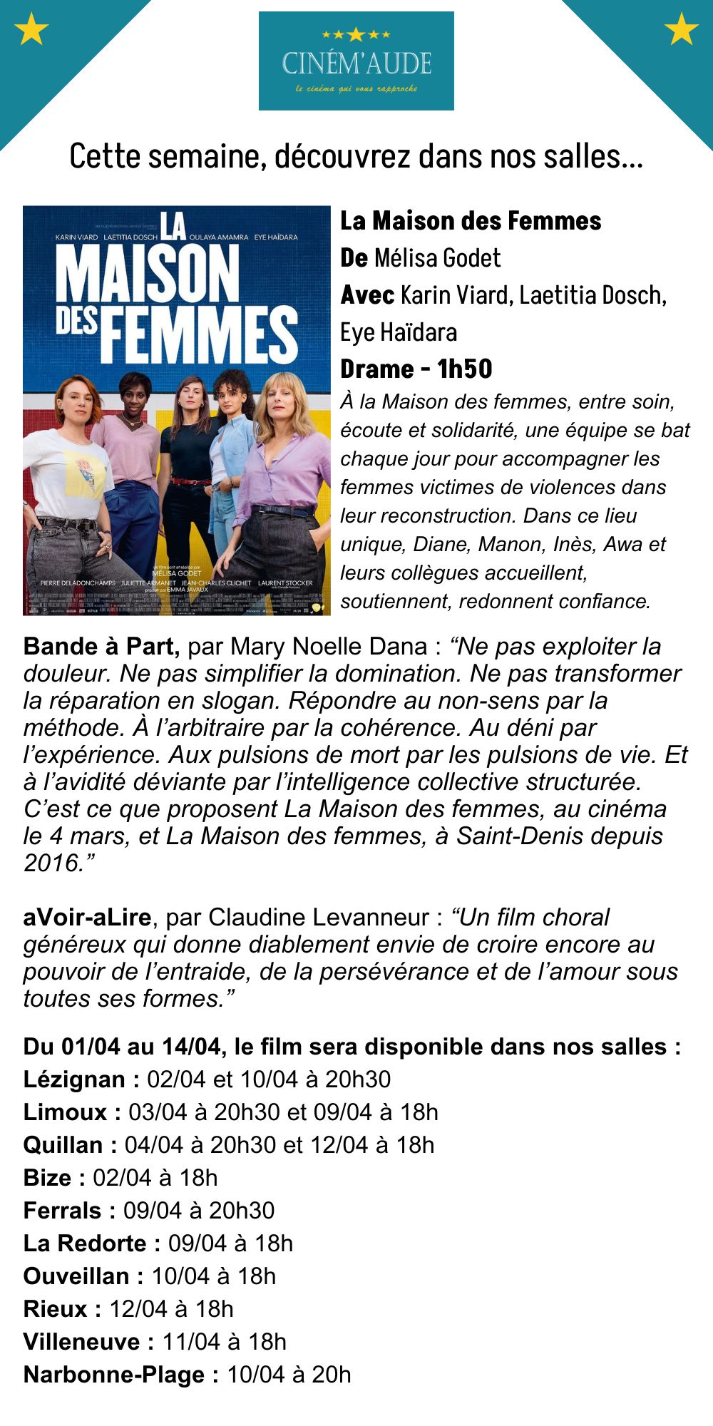 Du 01/04 au 14/04, découvrez dans nos salles "La Maison des Femmes", un drame engagé de Mélisa Godet.