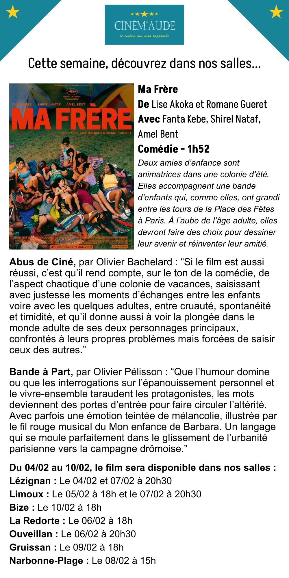 Le film sera diffusé dans les salles de Lézignan, Limoux, Quillan, Ouveillan, Bize, et Gruissan ! Consultez nos programmes pour plus d'informations.